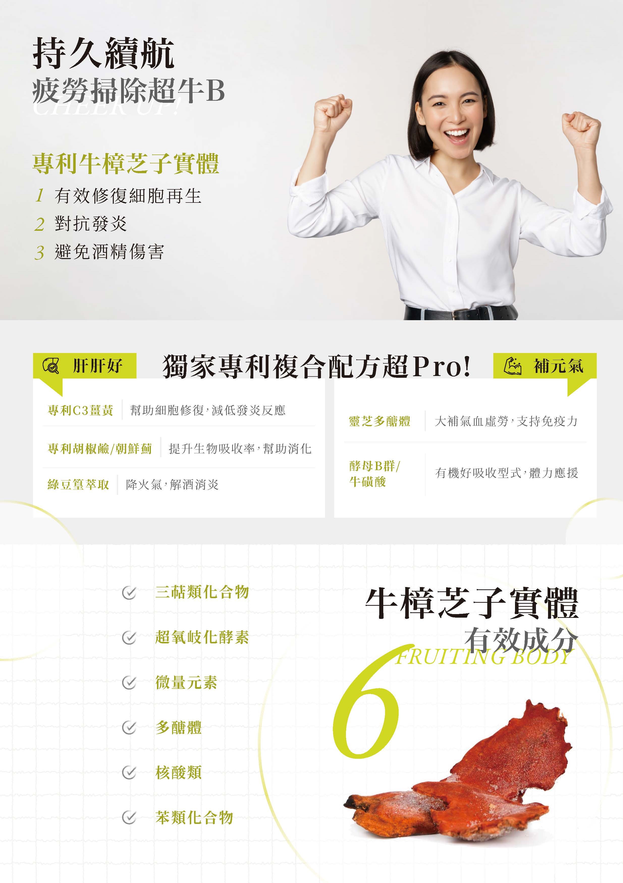 ✔ 真牛B專利牛樟芝子實體+天然酵母B群+牛磺酸,精神百倍旺盛。